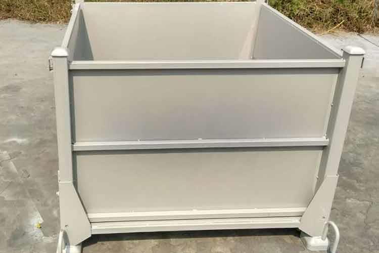 3、帶輪金屬周轉(zhuǎn)箱表面采用鍍鋅或靜電噴塑處理,便于清潔、不易污染;